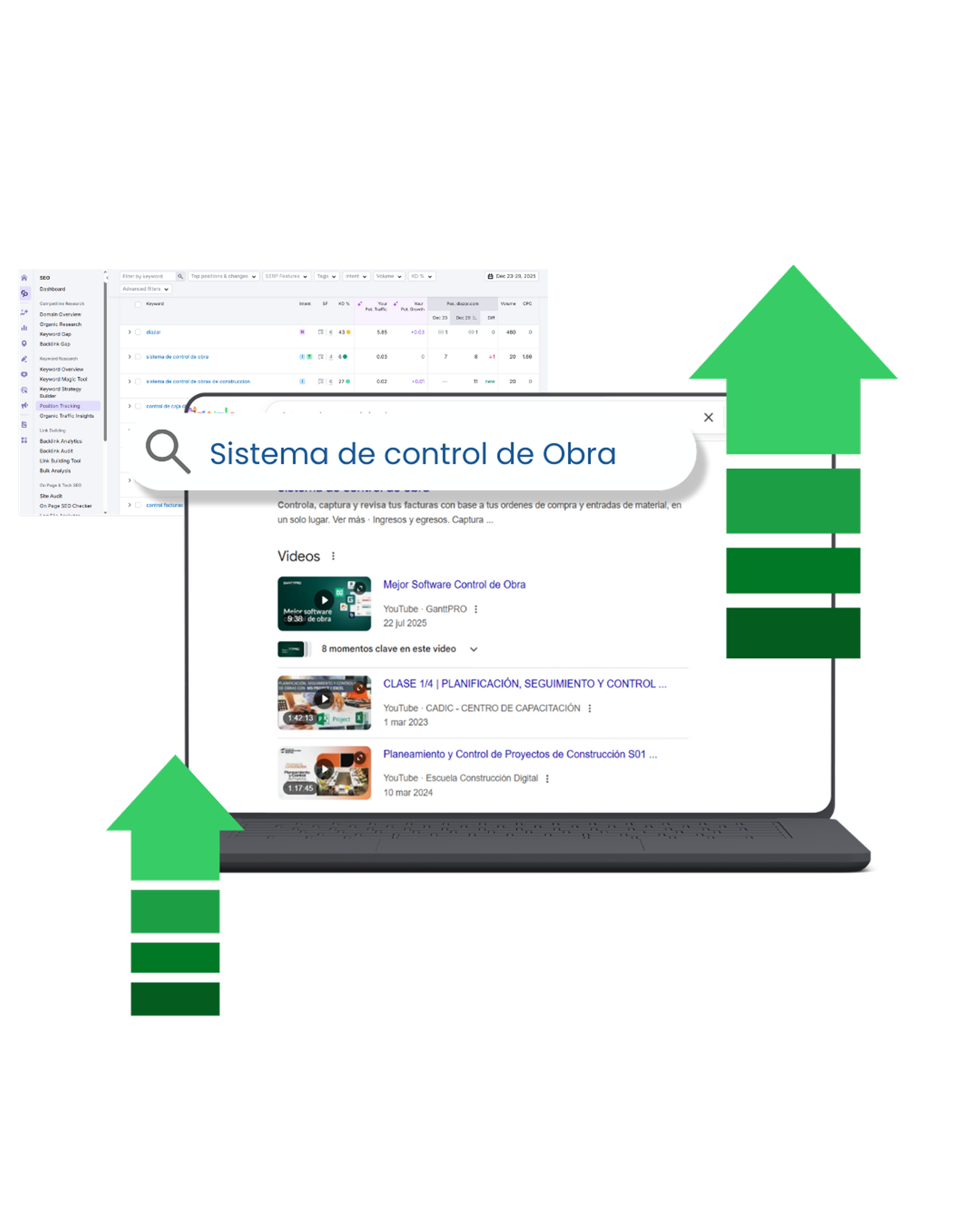 Estrategia SEO enfocada en posicionamiento a nivel nacional, estructura del sitio, metadatos, contenido (blogs) y palabras clave relacionadas con software y gestión de proyectos de construcción.