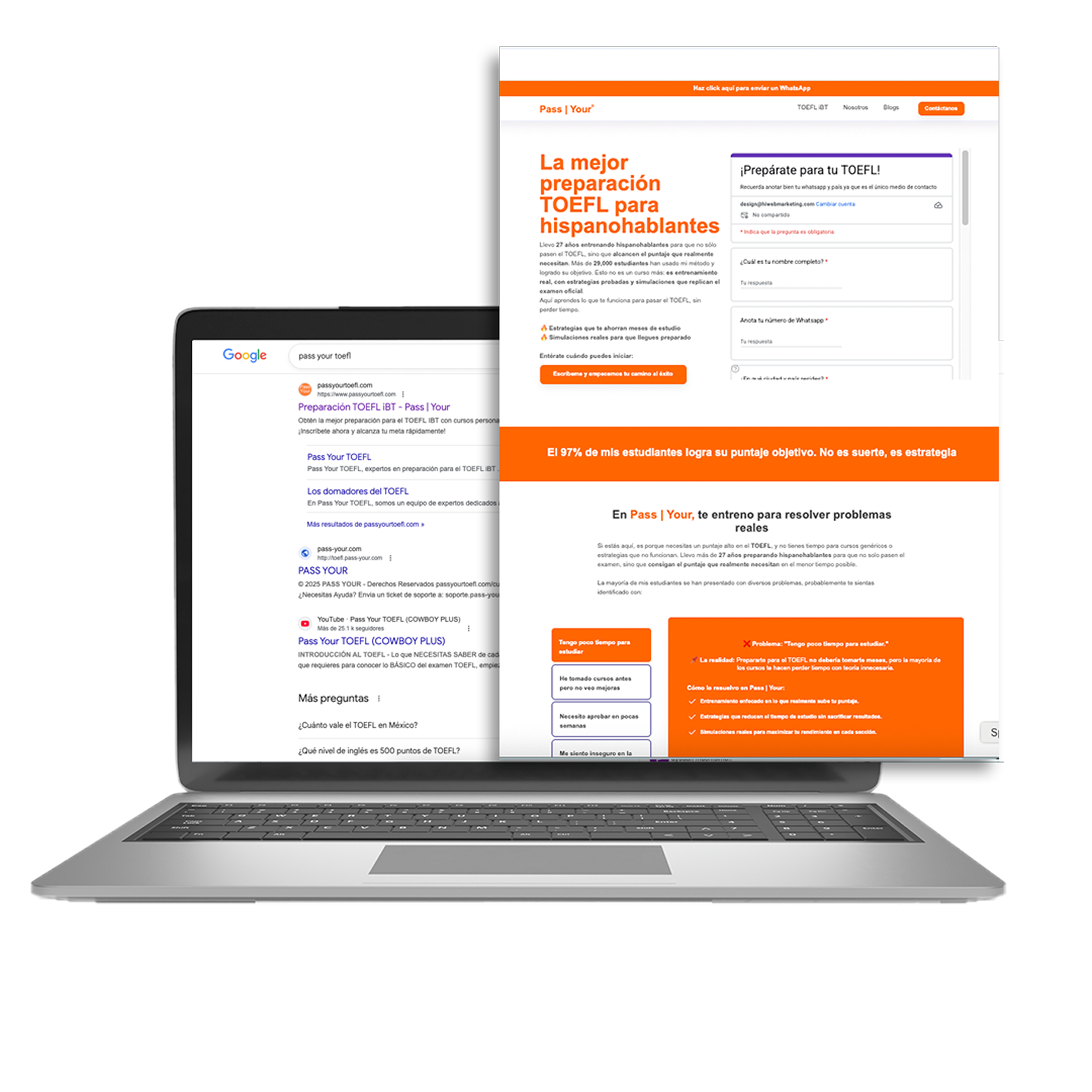 Pass Your buscaba un sitio web más profesional y enfocado en conversión, aumentar su visibilidad orgánica y generar ventas de programas de alto ticket. Llegaron a Hiweb de forma completamente orgánica desde Google, con el objetivo de escalar su presencia digital y atraer prospectos calificados mediante una estrategia integral.